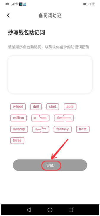 第八步、按刚才保存的助记词顺序,输入助记词,以确认备份的助记词正确。最后点击“完成”,如下图: