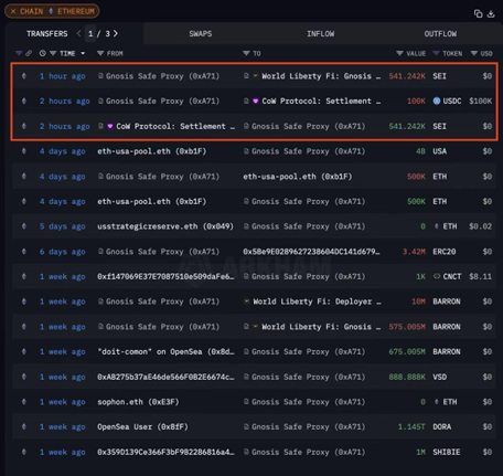 近日,链上数据显示,特朗普支持的金融机构 World Liberty Financial(WLF) 在以太坊网络上购入 541,242 枚 SEI,交易金额约 $100,000,并将其转回至 WLF 的主地址。这一资金流动迅速引起市场广泛关注。